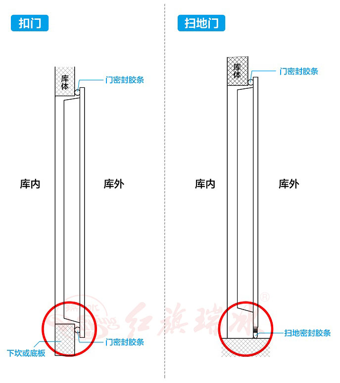 發(fā)布人:冷庫板_聚氨酯冷庫板_冷庫門_冷庫庫板價格_天津紅旗制冷 發(fā)布時間:2018-04-25 小編繼續(xù)為大家講一下聚氨酯冷庫門的兩種形式。一種為扣門,另一種為掃地門。有很多客戶訂貨時對這兩種形式有些疑惑,主要區(qū)別小編已經(jīng)在下圖標(biāo)注。